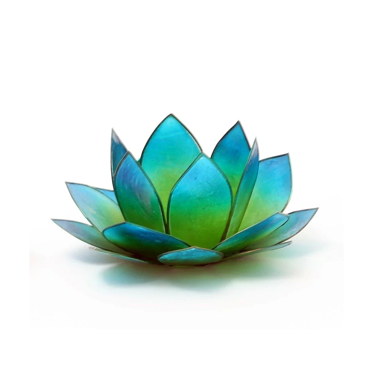 Das Lotus-Licht Sonnenaufgang in Grün-Blau bringt einen erfrischenden Farbakzent und ein harmonisches Lichtspiel in dein Zuhause. Mit einer Höhe von 5,5 cm und einem Durchmesser von 13 cm ist dieses bezaubernde Deko-Element ein wahres Highlight in jedem Raum. Die Metallfassung und die zarten Muschelplättchen in einem faszinierenden Grün-Blau-Ton erzeugen eine beruhigende Atmosphäre und lassen das Licht sanft schimmern.