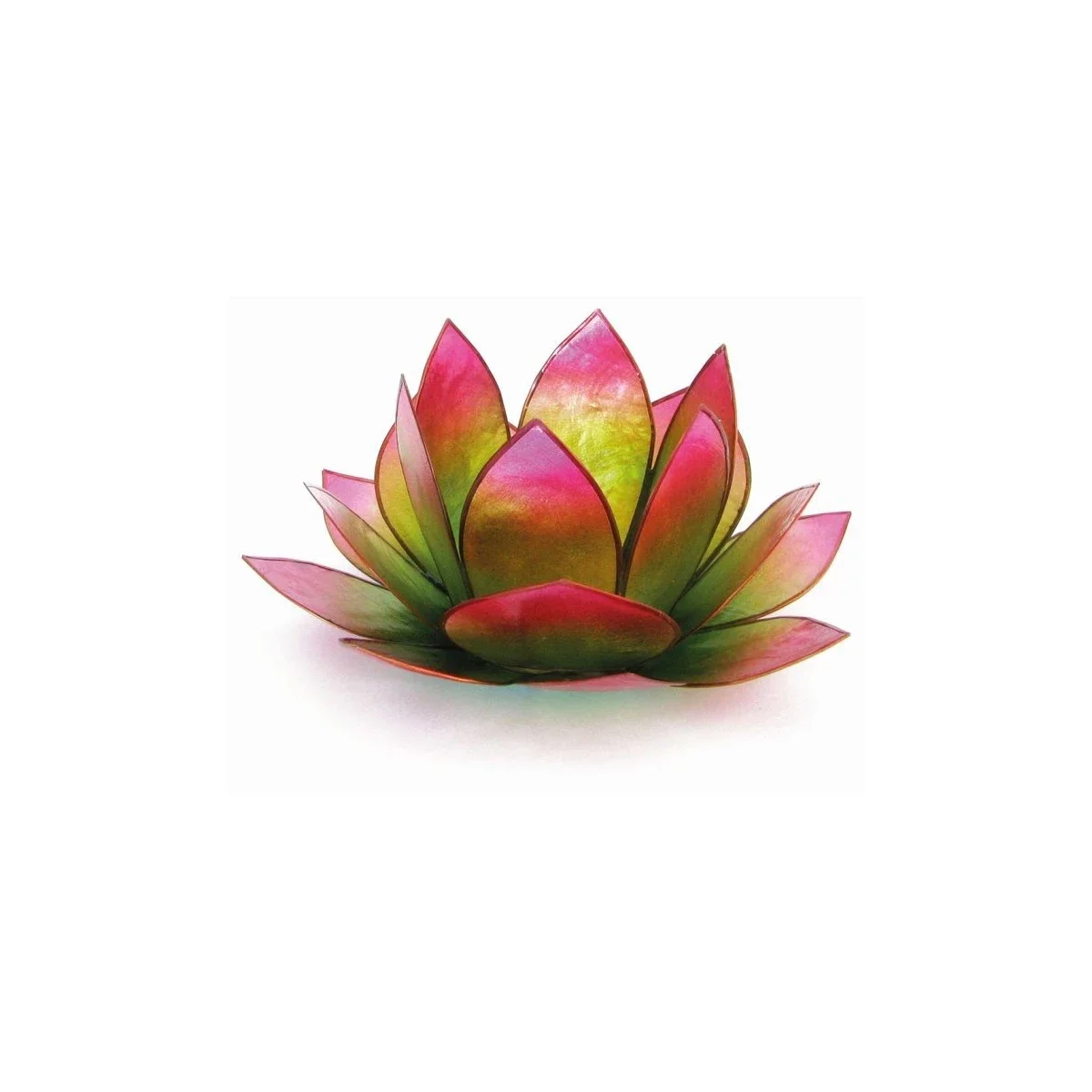 Bringe Farbe und Energie in dein Zuhause mit dem Lotus-Licht Sonnenaufgang in Grün-Pink. Dieses einzigartige Deko-Element mit einer Höhe von 5,5 cm und einem Durchmesser von 13 cm zieht alle Blicke auf sich. Die Metallfassung und die zarten Muschelplättchen in lebendigem Grün-Pink erschaffen ein wunderschönes Farbenspiel, das deinem Raum eine fröhliche und gleichzeitig entspannende Atmosphäre verleiht.